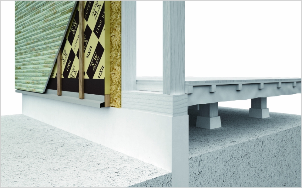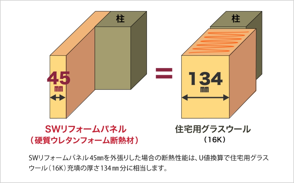 断熱材には、最高水準の断熱性能を誇る、硬質ウレタンフォームを使用しています。断熱材区分トップレベルの硬質ウレタンフォームは、熱伝導率0.019 W/m・K。外張り断熱の効果で、柱などの木材が熱橋とならずに高い断熱性能を発揮します。