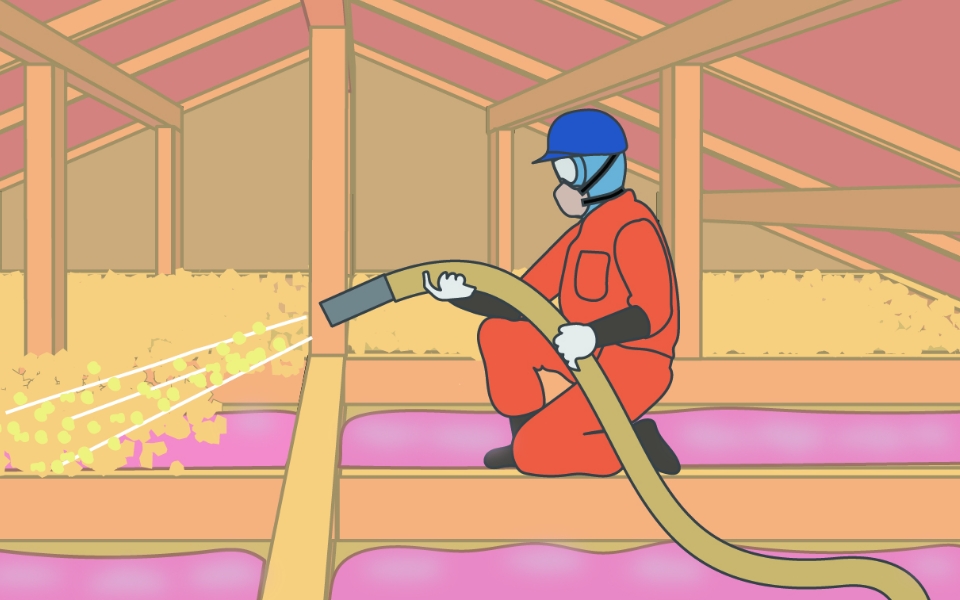 住まいながらの断熱改修を可能にする吹込み用グラスウールはリフォームでの天井断熱に最適です。天井への負荷が少なく、小屋裏空間に断熱材を厚く充填することが可能です。※IBEC 優良断熱施工システムの認定工法です。