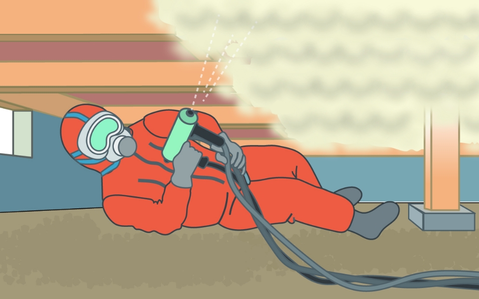 床下の断熱改修に最適な吹付け硬質ウレタンウォームは落ちずに密着します。床組の隙間を埋めることができるので、気密を高めるのに適した仕様です。※IBEC 優良断熱施工システムの認定工法です。