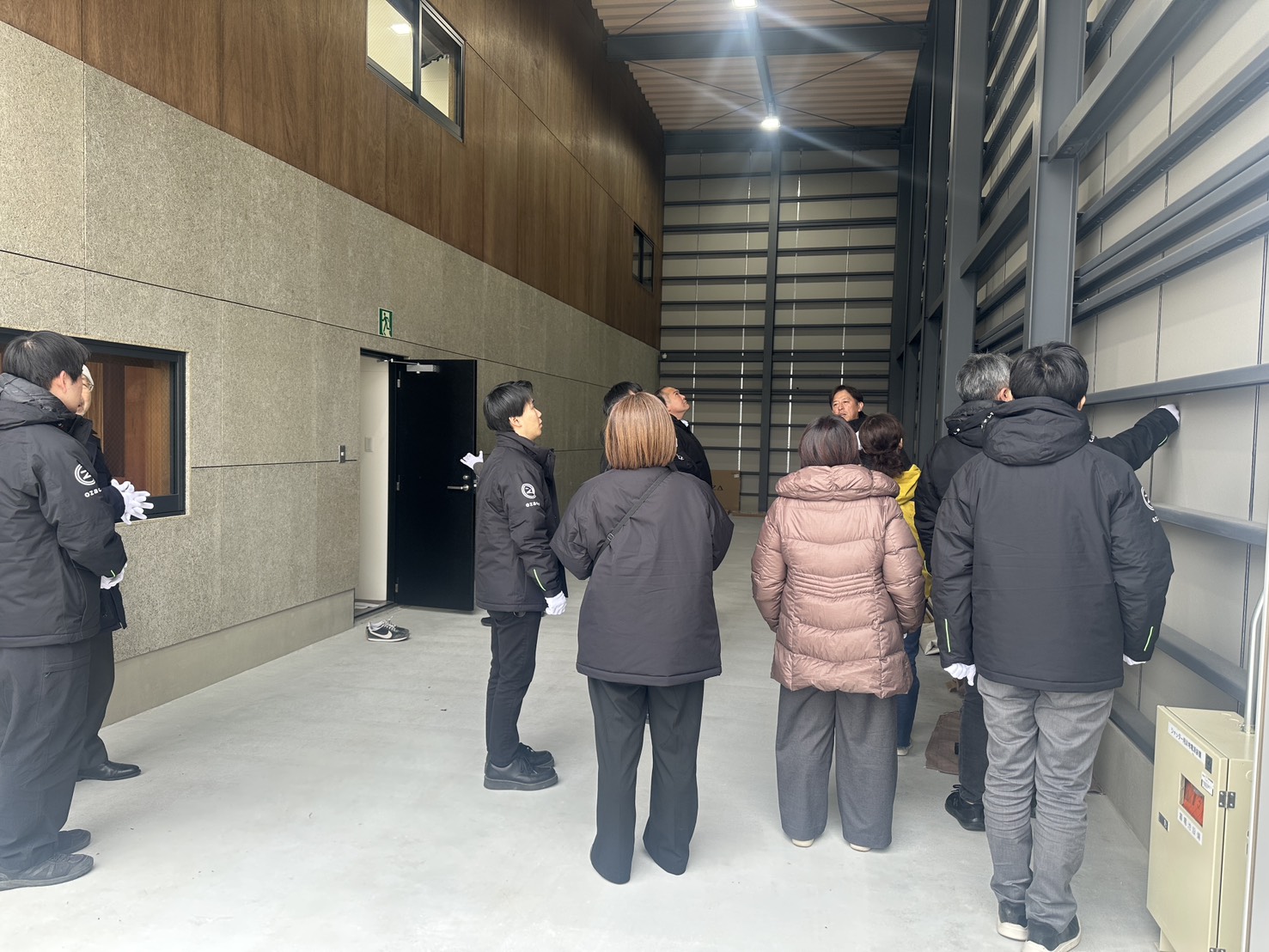 勉強会のスタートは、弊社の工事中の現場案内から! 実際に私たちが今手掛けている現場に足を運び、収まりや施工の工夫を直接見ていただきました。