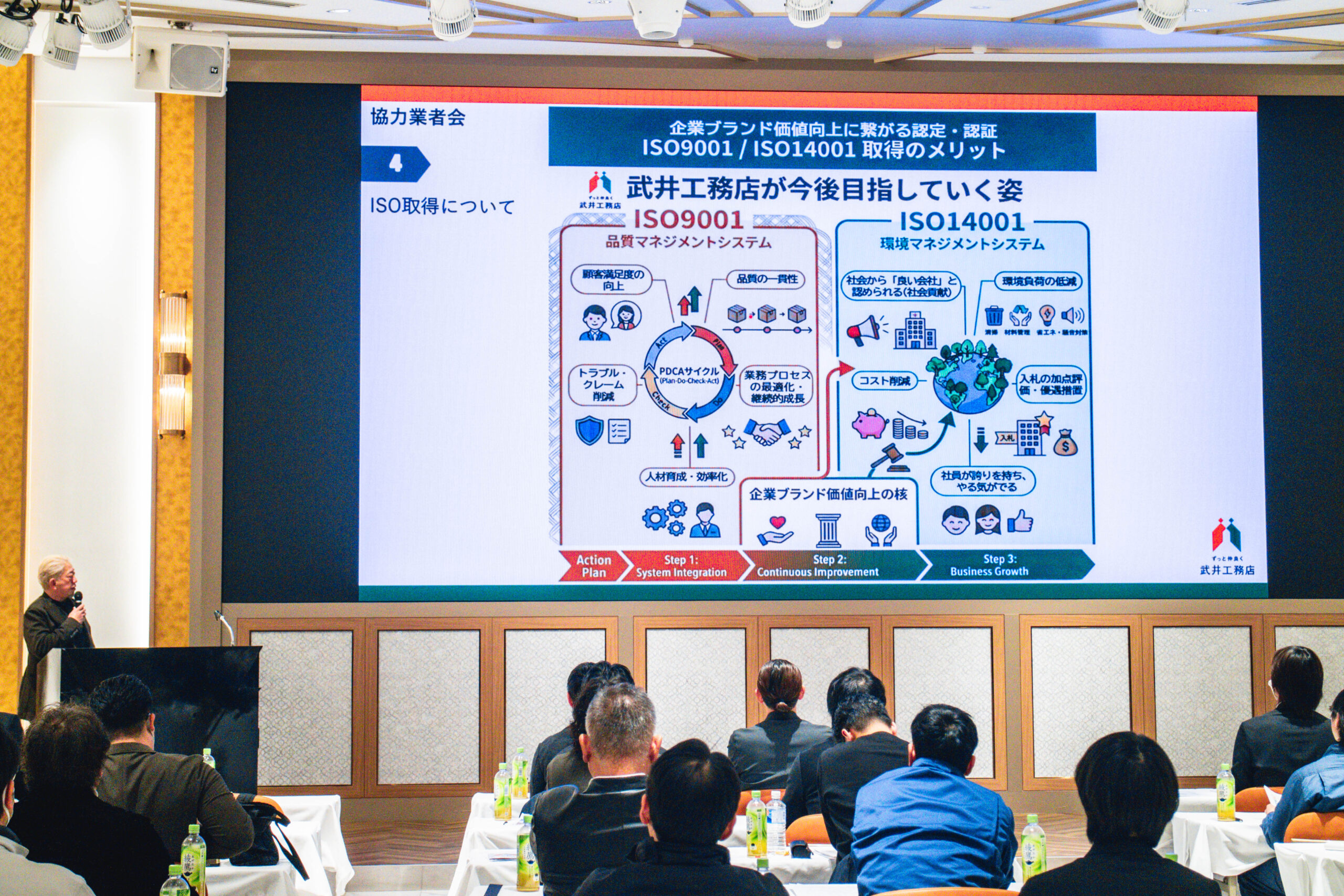 協力業者会では、武井工務店の今期の取り組みであるISO取得についての説明も行いました。
