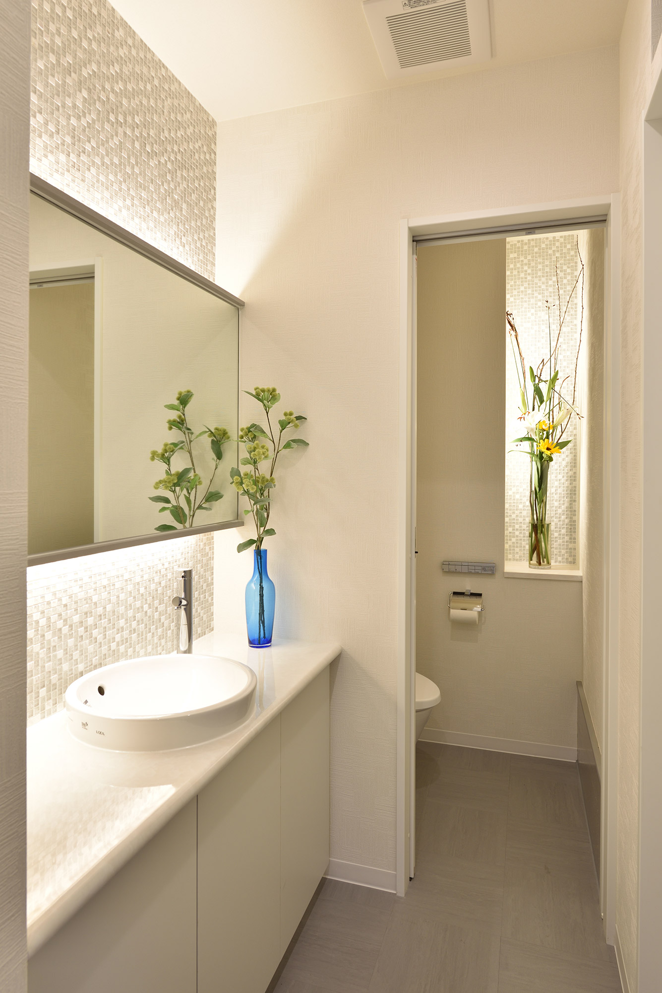 白い3階建ての建物は角地に映えます。 1階はエステサロン、2階と3階は一人暮らしにぴったりな賃貸マンション。 エステサロンは白を基調にエレガントな雰囲気。 2階、3階は白を基調にしつつも赤いキッチンがアクセント。