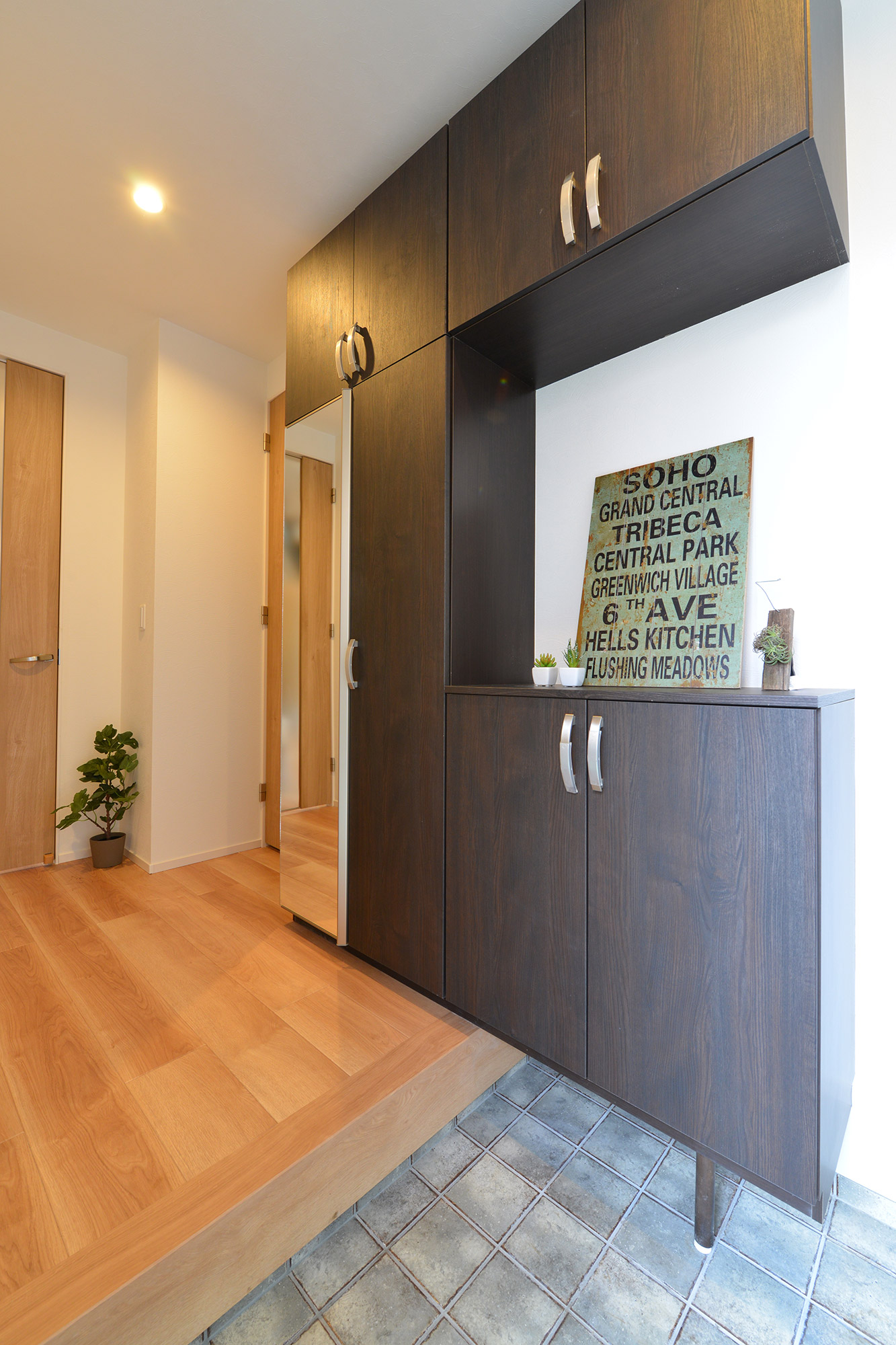 料理が楽しくなるモザイクタイルのキッチン。対面式カウンターで家族との会話も弾みます。 キッチン横にはママの家事が可能なパントリールームを設けました。 スケルトンの階段上にもちょっとしたくつろぎスペース。 モダンな和室は1段高くして収納も兼ねました。 タイルを使ったニッチは奥様のお気に入りです。